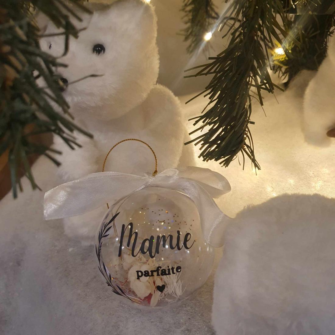 Cette boule de Noël personnalisée, avec l'inscription en vinyle permanent "Mamie parfaite", est une attention pleine de tendresse pour célébrer la grand-mère qui illumine vos fêtes. À l'intérieur, des morceaux de feuilles d'or scintillantes et de délicates fleurs séchées ajoutent une touche raffinée et précieuse. Suspendue au sapin, cette décoration festive devient un symbole d'amour et de gratitude, idéal pour rappeler à Mamie combien elle est spéciale. Un souvenir unique à chérir chaque Noël.