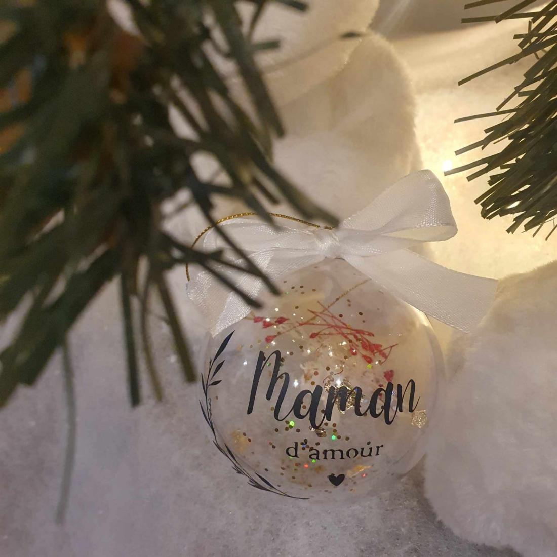 Cette magnifique boule de Noël personnalisée, ornée de l'inscription "Maman d'amour" en vinyle permanent, apportera une touche unique et élégante à votre décoration festive. À l'intérieur, des morceaux délicats de feuilles d'or scintillantes se mêlent harmonieusement à de charmantes fleurs séchées, créant un effet raffiné et poétique. Parfaite pour offrir ou pour sublimer votre sapin, cette boule de Noël est un hommage tendre et intemporel à une maman précieuse.